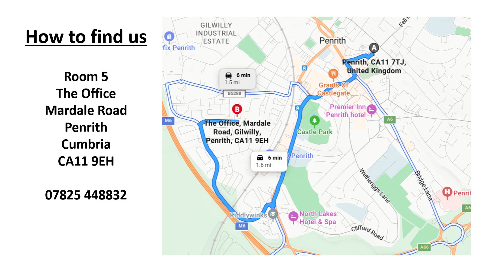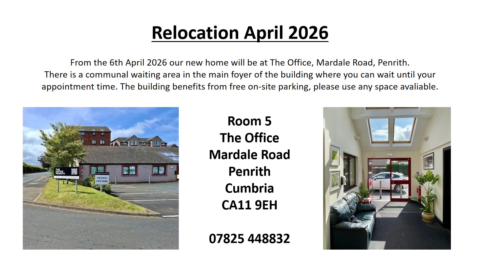 From Monday 3rd July 2023 clinics will resume at 29 Sandgate, Penrith, CA11 7TJ. As before, please enter the building and follow the corridor to the waiting room at the rear. Dr Bailey will come and find you at your appointment time.